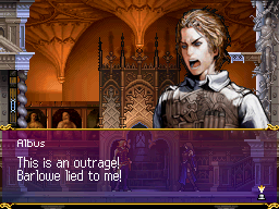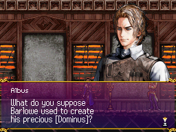 Shanoa joined Barlowe in Ecclesia's ceremonial room and readied herself for the ultimate of channelings. The proud Barlowe explained that it would be nearly impossible for her to control Dominus' power under current conditions, thus the importance of a ritual that would allow for her body to adjust to such a power. Shanoa moved to make a declaration as to her intentions in following this upcoming mission, but she was overcome by Barlowe's overwhelming excitement and instead moved into position. Barlowe began the incantation, Shanoa's cue to begin absorbing; unexpectedly, the room went dark, the ritual interrupted by an unknown force. It was Albus, whose intrusion caused a violent halt to the proceedings. "You lied to me," he fired at Barlowe, who countered that Albus' inability to follow orders led to his lack of understanding the truth--that only Shanoa had the power to channel glyphs, which was the necessary ingredient to harnessing Dominus. Rather than agreeing to Barlowe's request that the three work together to overcome his weakness, Albus simply absorbed Dominus for himself, announcing his intent to use the power to launch his own mission. Barlowe acted quickly in trying to subdue Albus with an electrically charged spell, which was met by a Max Shot fired from his glyph-powered Agartha pistol. "You are my master no longer," he hissed at the flustered Barlowe, who was watching Ecclesia's years of work go up in flames. Albus then escaped the building, his scheme unknown.
