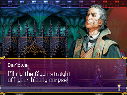 The two battled within that forbidden room, Barlowe eventually brought to his knees. He was so close to tasting the power he so desired. Why, Shanoa wondered, would he want such a power knowing that it would cost him his life? Without Dominus, he explained, he could never destroy the seal and release Dracula into this world, which was "the realization of Ecclesia's mission and the singular wish of all mankind." The shocked Shanoa swore that mankind wished for no such thing. Sounding a bit like Dracula, Barlowe stated that it is indeed mankind's wish, that their hearts yearn for his presence; if not, why would he return again and again? As Shanoa correctly asserted, these were the words of just another of Dominus' victims. The enchanted Barlowe, his strength returning, began hovering, gravitating toward toward the vessel. Ready to destroy the seal by sacrificing himself, he inched over to the vessel and in preparation for the Count's return screamed "Lord Dracula!" Sensing the emergence of a new power, Shanoa could only watch as the vessel exploded, vaporizing Barlowe in the process. The sudden rising of Dracula's castle was proof of the ritual's success, the Dark Lord no doubt free to again take up residence. For Shanoa, it seemed all was lost.