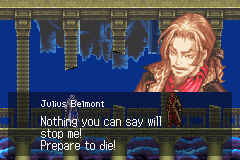 His final meeting was another with J, who by now had regained enough of his memory to remember that he, Julius Belmont, was the one that vanquished Dracula back in 1999. Soma informed Julius that Graham was indeed Count Dracula incarnate; Belmont, though, had a hunch that he was not. "Pray that my hunch proves to be wrong," Julius said, ominously. Belmont remembered one other thing, which spurned his new goal to locate the Vampire Killer whip, which he had sealed away in the castle, back then, as a symbol to further weaken Dracula's spirit essence and magical powers.