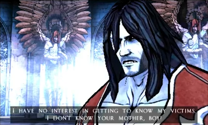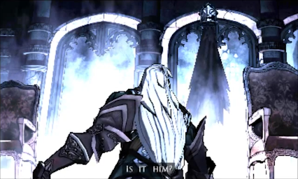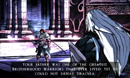 Before Simon sat Dracula, resting on his throne. "You fight well--worthy of the name 'Belmont,'" he complimented. Simon wasted no time in making clear his intent: He had come to avenge his parents and destroy the Dark Lord. Dracula laughed, wondering how, exactly, he planned pull off such a feat. "With the Combat Cross?" he asked, amused. "That relic has no power over me." Dracula boasted that he had killed his father and then promised that Simon would suffer the same fate. His arms becoming fiery with enchantment, Dracula made one final threat: "You'll die in vain as did your father." Steeling himself, the assured Simon held his ground: "We'll see about that, won't we?" As the two prepare for battle, the tower's door suddenly opened, the light pouring in as accompaniment to the figure who Simon recognized as his unsociable ally but who Dracula knew specifically: "Good of you to join us, Alucard."