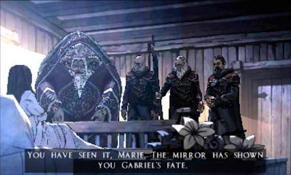 Unbeknownst to Gabriel, as he carry out his mission, elders from the Brotherhood visited his lovely wife, Marie, in their home. As she lay in her bed in a state of despair, she could only stoically gaze at the vision as seen through a special amulet, as shown to her by Pan; the clairvoyant artifact, somehow connected to the Mirror of Fate, clearly revealed Gabriel's unfortunate future. They had only one option: They must take from Marie her son Trevor, about whom Gabriel never knew. Trevor and his offspring would be the only ones capable of facing Gabriel in the future, and this lineage had to be protected from Dracula and his war against the Brotherhood who wronged him. The elders informed her that they would return at nightfall to take the boy into their care. The shaken Marie could only weep, knowing that the Brotherhood's plan was best for all involved. |