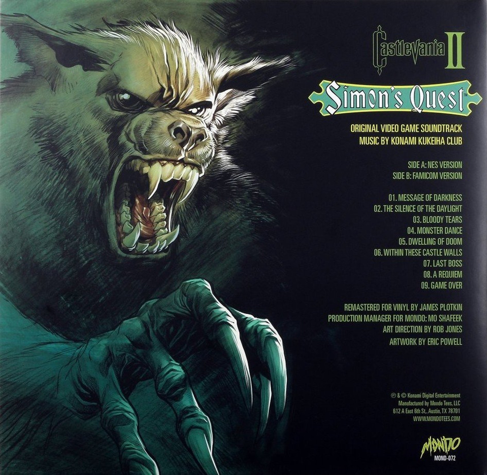 This the casing for the viynl release of Castlevania II: Simon's Quest - Original Video Game Soundtrack, whose tunes were composed by Konami Kukeiha Club. It was made to commemorate the series' 30th anniversary. The soundtrack features all 9 of the game's tunes. The artwork was created by Eric Powell. (These scans were contributed by Francisco R.)