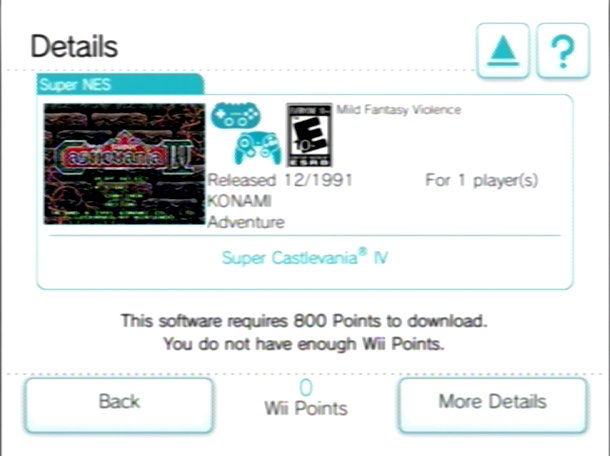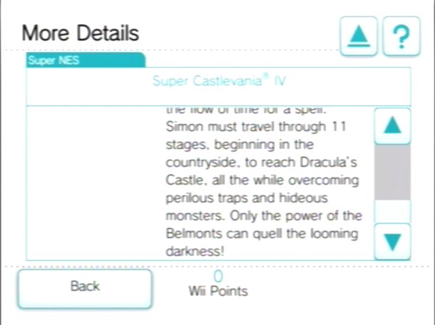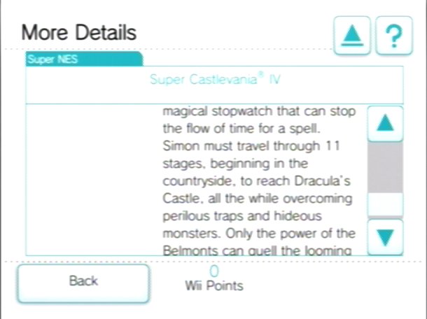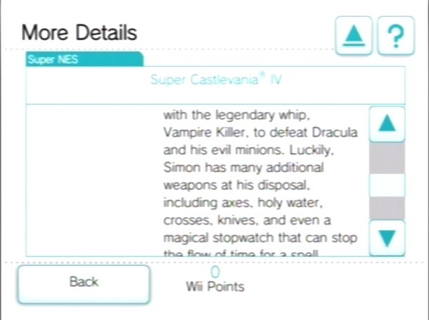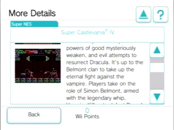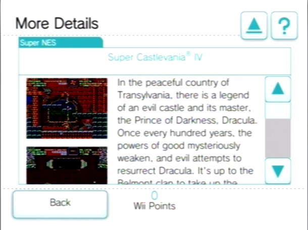On Christmas of 2006, Konami gave retro-gaming fans a nice little present in the form of Super Castlevania IV for the Nintendo Wii's Virtual Console; it is by its very appearance on the Shop Channel the first digitally downloadable series game for consoles. For a price of $8 (or 800 Wii Points), customers can buy the SNES classic and play it using a GameCube controller or the system's own Classic Controller (sold separately).