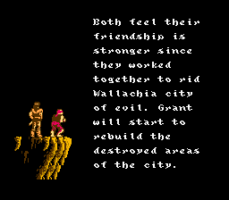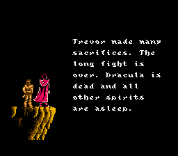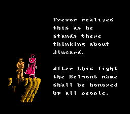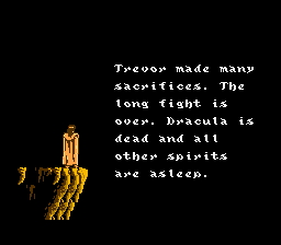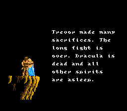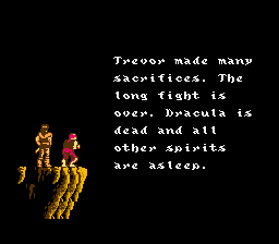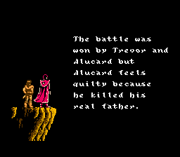 Dracula's Curse has four endings, depending upon the helping spirit, if any, whose services you utilized; the endings are followed by the credits, which run the same no matter the ally chosen. (As a bonus, listed is the "alternate ending," which you'll receive for finishing the game after completing the second, more difficult quest or by inputting the starting name "Gameteam." It features actual staff credits in place of the character name-listing.)