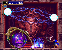 After defeating the game with Alucard, you can play with Richter. After defeating Shaft (but not Dracula, since he won't appear as a boss for Richter), the game ends. Both Castlevania and Shaft's reverse version of it are sucked into a netherworld.