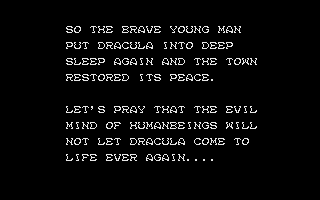 After telling you that you have destroyed Dracula and restored peace to the land, the credits begin to roll. Then you get the mandatory "Presented By Konami: Thank you for playing." That's just about it--no standing on a mountain cliff as the castle crumbles or anything.