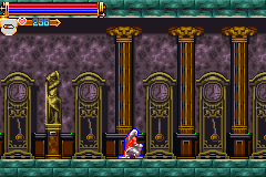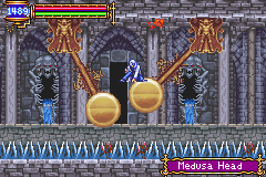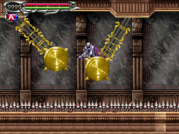 | Finally, while not the conventional placement, future developers have played off of this level design even if not duplicating it; that is, similar sets of pendulums appear in Harmony of Dissonance, Aria of Sorrow and Dawn of Sorrow. Harmony's instance is not indicative, since the clock tower's positioning is off, but Aria and Dawn of Sorrow's can be considered a relatively close match, because the keep isn't that far off from either position. |