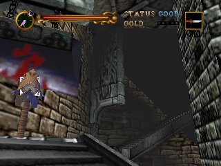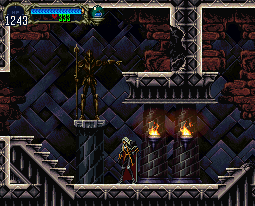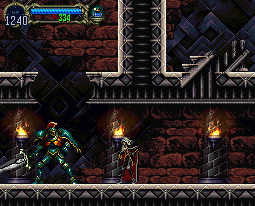 | In both instances, the next long hallway has a maze of stairs where sword lords will block the narrow passageways. Even the designs on the pillars look the same--bricks that spiral around. And the breakable wall--obviously showing in the Rondo picture, above the sword lord--can also be broken in Symphony. In both games, the tower exit can be reached by utilizing two large swinging pendulums. |