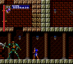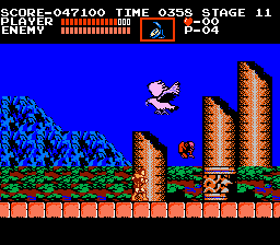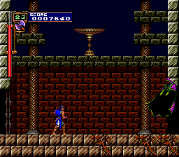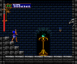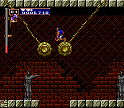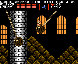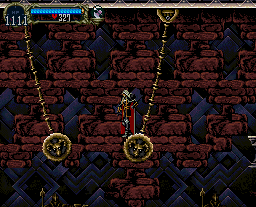 | There are many instances, within that ever-changing clock tower, of swinging pendulums, but there are certain times throughout the series where you'll come to a long gap that can only be traveled over using a set of two (and usually three) pendulums. The first instace you'll remember is Dracula's Curse's: While avoiding Medusa Heads, you had to jump from pendulum to pendulum in order to escape to the castle keep. As a nod to this sequence, the creators of Rondo patterned their clock tower to match it; the placement is about identical, with only a short hall thereafter connecting to the keep. We've already learned of the similarities of this tower and Symphony's, so this pendulum instance exists here all the same. |