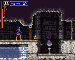| In his Rondo of Blood adventure, Richter locates Maria in a sealed off chamber at the tail-end of the fishmen-inhabited room right below the main hall. Richter unlocks the door using a key he found in the main hall while fleeing from the raging bull, only to find a single-torch-lit room where Shaft is holding her within an ambient blaze that'll soon banish her into a netherworld of eternal suffering. Shaft flees at the sight of the hero, and Maria is saved. Four years later, when Alucard returns to the castle (as does Richter) in Symphony, he can find the same room in exactly the same location, however small it may may look from his vantage point. And it's once again blocked off, this time by a stone barrier--but there's no key in the main halls to be found. Rather, you'll eventually lower the barrier by hitting a switch when you enter into the room from the other side via the Underground Cavern. |