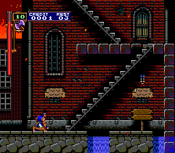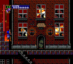 | You'll recognize the town of Jova as the place you begin in Simon's Quest. The town itself is bustling with activity, and zombies walk the streets at night. Almost one hundred years later, in Rondo of Blood (where the town for some reason has swapped its name with Aljiba, which was actually another location in Simon's Quest), the town is completely destroyed in Dracula's wake, and Richter must cross through the fiery debris while ape skeletons continue blowing things up with their exploding barrels. Whereas Simon met many villagers, Richter will enter the town only to be greeted by a barrel-carrying ape skeleton. |