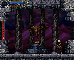 | Castlevania: Symphony of the Night is a true sequel to Dracula X: Rondo of Blood in that it utilizes similar castle structures and the same sprites. The clock tower in both games shows this. In Rondo, the stage starts on a long, collapsing bridge, mutant bats hoarding the area, while Symphony has the same bridge area, with flail guards, phantom skulls and skull lords creating a similar obstacle. The three main towers of the clock area are the same, too, with harpies and/or Medusa Heads flying all around, and the gears that you can strike to open hidden doors are present in both games. |