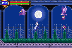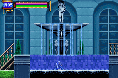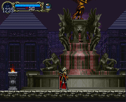 | By the time of Aria of Sorrow, the former ruins had been supernaturally crafted into an anomalous pathway, from where the entrance into the Chaotic Realm and the castle's sealed essence, could be camouflaged within. Upon entering the area, called the "Floating Garden," you'll notice the building in the background that could be the castle wall or possibly the very same Villa from games' past; you'll also notice the familiar fountain. As mentioned: The path is anomalous, so each room of the garden mysteriously branches off into map sections spread castle-wide. In one of the area's "floating" rooms close to the Castle Keep, you'll encounter altairs who transport and drop dagger-chucking rippers (the proverbial "eagles carrying hunchbacks" that was once a trademark of this area). While it doesn't make much sense structure-wise, it can help us explain why Symphony's eagle-carrying-hunchback room is so far away from the fountain: What we were viewing while playing the game is the early stage of the breaking apart of the ruins in its supernatural transformation into the Floating Garden. |