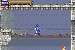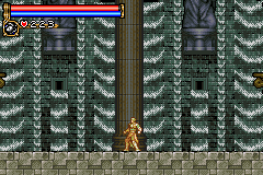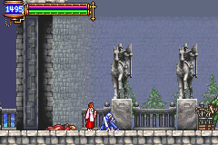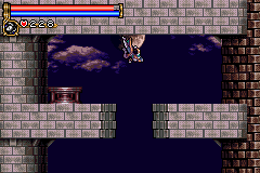 | We find this instance once again in Castlevania: Aria of Sorrow, which is situated in an atypical time-period. So, obviously, a lot has changed since the 1800's and Nathan's trials. To wit: The expanded entrance has now been encapsulated as an actual part of the castle, the woodland view eliminated in favor of stone walls, statues and some shrubbery. What hasn't changed is the structure: Soma Cruz will begin his adventure at the familiar entrance, where friendly forces will gather as it rages on, and he can eventually charge his way upward either by superjumping or by flying up in bat form. As usual, a power-up (in this case a Lucky Charm) awaits. |