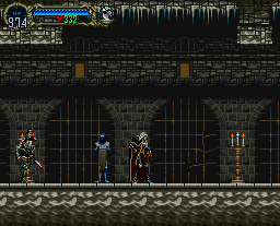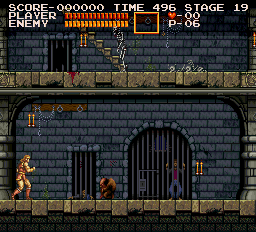 The fifth stage of Castlevania, the dungeon, is regarded as one of the more infamous, for its energy-gobbling baddies and its considerable boss guardian, the Grim Reaper. Konami knew well that fear and sought to play upon it by patching in a reminder every now and then. The dungeon is immediately noticeable by the elements of its entrance room: Its hewn-in prison chambers, its holding contraptions, the dreary color tone, the remains of its habitants, the skeletons, and the dreaded hunchbacks. None is more obvious than stage seven of Akumajou Dracula X68000, which is its own rendition of the Simon's NES adventure; its dungeon is remake of that classic stage and features the same decor. New additions include living prison habitants--mainly the two-headed beast that breaks free. One hundred years later (in Rondo of Blood), Richter would pass through this same room only to encounter the same obstacles. And five years later (in Symphony), Alucard would find a slightly refurbished dungeon entrance, inhabited only by bloody zombies. Its dungeon is a part of Olrox's Quarters, stuffed high up in its top-right corner. The positioning is correct because we've already established that Olrox's Chamber represents the ruins, and in Castlevania, the ruins lead upward, into the dungeon. (Suggested by Kev.) |