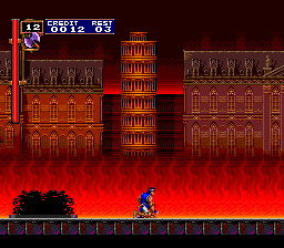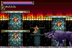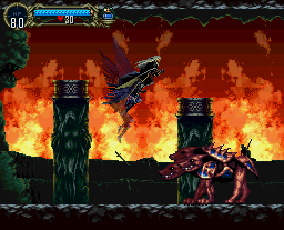 It's no stretch to say that the developers from the now-defunct KCEK were paying really close attention to Symphony of the Night and its design when they created Circle of the Moon. It inspired their choice of genre, their use of names, and even some overlooked battle scenarios (the expanded entrance, for instance). Another overlooked scenario is the Cerberus battle. In Symphony, Alucard will meet up with the hound from Hell in a long room located in the Abandoned Mine, where the raging flames make the beast feel right at home. In Circle of the Moon, the map position is just about identical: In the catacombs, a like underground area, Nathan Graves will accost the multi-headed hound a long room highlighted by the raging flames of Hell. In both screenshots, you can even see that the rooms' platforms match each other in height and distance. (Suggested by Kev.) |