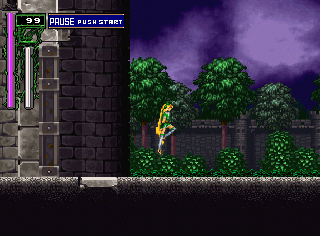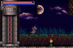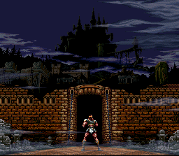 | When you first begin in Symphony of the Night (or its cousin over on the Saturn), your character will hop over the drawbridge and slip into the castle, its doors slamming shut. Using their super-jumping ability (or Alucard's bat ability), the heroes can work their way upward into a closed-off storage room to find a power-up directly above the entryway . In Circle of the Moon, you will eventually work your way up from the castle depths to find the main halls; outside, you'll find the same entryway. You can use Nathan's super jump to reach that same closed-off storage room for a power-up. The main graphic similarity in both games is the shrub-lined brick wall in the background. The castle gardeners probably cut down all of trees between the 40-year-plus period before Nathan and friends arrived here. |