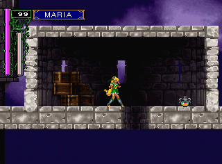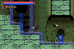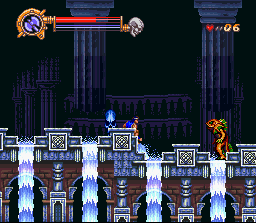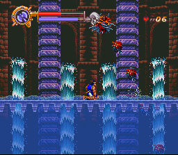 | After saving Maria in Castlevania: Dracula X, you could use a key to open a locked door leading to the hidden springs and thus escape from the catacombs. Structure- and position-wise, Circle of the Moon's waterway is very similar. You can see, however, where KCEK's influence for the latter part of this area comes from. In the last part of each area, you'll be accosted by merman/fishman and foes that fly in from above. Soon after, you'll enter into a boss room outlined by a series of waterfalls. |