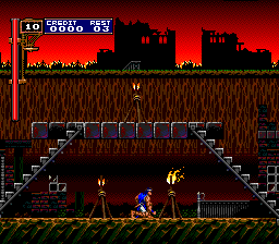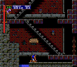 | When Castlevania: Symphony of the Night was ported over to the Sega Saturn by KCEN, they created a new area called the "Cursed Prison," a rather pointless maze-like area (zigzagging, you could say) where the visuals do most of the work; in the background, you'll see the chained and lynched remains of the unfortunate souls sent to die here. What may have been happening here was KCEN testing out an idea in preparation for their next project--Castlevania Legends. Indeed, we can see that they were building to the dungeon that was to be the game's bonus stage. Like its predecessor, it's a maze of platforms, and you can see the remains of people sent here. Even the pesky spear guards return to impede your progress. |