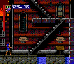 | You've learned about Jova and how it changed from the time of Simon to the more advanced time of Richter. But the town started taking form even before that, two hundred years before Simon even made residence here. It started in that remote area of Warakiya, the ravaged village where Trevor starts his adventure in Dracula's Curse. The creators of Rondo took this entire stage design into consideration, almost block by block, and they envisioned a more bustling version--starting with the town entrance shown above, with the staircase-platform combo and the torches placed underneath. |