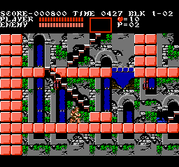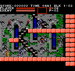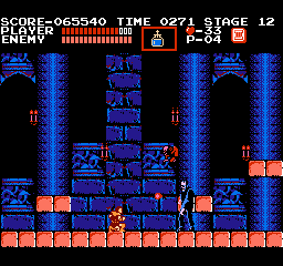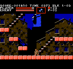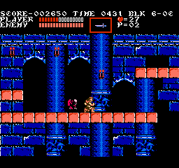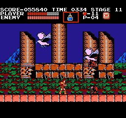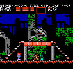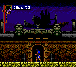 | A more specific instance of familiarity within the outside ruins is showcased between two NES entries: Castlevania and Dracula's Curse. There are two sections of one stage that are slightly different but altogether similar. The first part of the puzzle is the path Frank's cavern. In Castlevania, as we know, it's where the eagles are dropping hunchbacks. In Dracula's Curse, on Stage 8, there's an initial path where there's a hunchback attack followed by a water-filled bridge. Amazingly, in both games, this path measures exactly 94 blocks, and they both feature backgrounds with the same damaged pillars. Thereafter, you'll enter into the cavern, where the similarities are more easily noticed--the graphics are completely recycled. You have the same pillars, arches, blue bricks and block patterns, and, again, the block distance is identical--64 blocks for this part of the path. From this, we can see that before it was left in ruins, it served as a bridge to redirect water into the caverns below (perhaps into Stage 9, the caverns that mirror the first area of Castlevania's Stage 4). The well, apparently, went dry. (Suggested by MeWiseMagic03.) |
