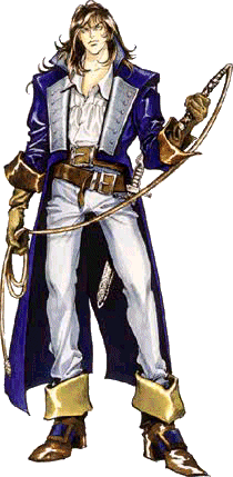 Nathan Graves, the Belmont descendant, was the star of the first GBA offering of the series--Castlevania: Circle of the Moon. Nathan doesn't stray too far from the path of typical Belmonts: He starts out with a regular leather whip, but it can't be powered up by normal means; however, using the DSS Card System, he can create one hundred different magical effects, twenty of which effect the whip, and ten others that allow him to replace the whip with other striking weapons or abilities. Since there are too many to list here, you can instead find this information on Circle's weapon page. In most forms, Nathan can brandish the whip, twirling it around and around by holding down the attack button. As for mystic weapons: It's all classic Belmont, with the same weapons we know and love: