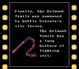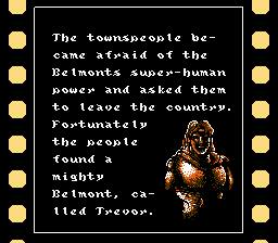 Finally, the Belmont family was summoned to battle Dracula's vile forces. The Belmont family has a long history of fighting evil. The townspeople became afraid of the Belmont's super-human power and asked them to leave the country. Fortunately the people found a mighty Belmont, called Trevor.