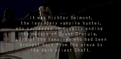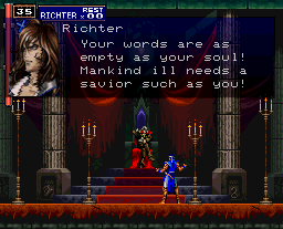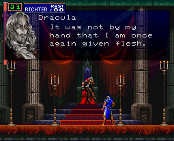 Dracula and Richter meet, prompting a brief discussion between the two (previously unheard in Dracula X: Rondo of Blood, which this battle represents--not Castlevania: Dracula X).