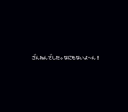 The Dark Void: While not really a helpful code, the following should help you squeeze a little more "enjoyment" out of your copy of Akumajou Special: On the title screen, enter the familiar Konami Code (up, up, down, down, left, right, left, right, B, then A), after which you'll hear a jingle that confirms the code's successful entry. When you hit the "Start" button, it'll take you not to the game but to a black screen with but one line of Japanese text. The translation: "Too bad. There's nothing here!" As you may suspect, there's no escape from this screen. It may seem like a rude gesture, but it does fit in with the game's mischievous nature. (Credit to: Gamefaqs.com.)