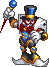Magic Man relies upon his many tricks to get the job done. His first trick involves throwing out his slashing cards, them returning to him like a boomerang. He'll also generate a quick, blue magnetic spark, which shoots quickly but doesn't return. Finally, he'll loop a balloon forward, it popping and releasing 3 little birds. He can also have little power-up-grabbing enemies walk across the floor during the battle.