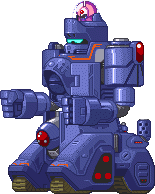 Now more powerful, King will command this huge metallic beast, it having 4 different attacks: (1) It'll rev up and dash into Mega Man, (2) It'll generate a powerful full-screen laser attack, (2) It throws out a little sphere that circles Mega Man, hurting him if he moves, and (3) It'll drop bombs—4 in all—onto the ground. The capsule containing King is the tank's only weak point.