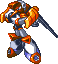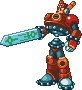 DL #059: Sword Man will try to impress Mega Man with his abilities. Firstly, he'll crash to the ground, forcing a huge boulder to fall from the ceiling, crushing Mega Man. Also, he'll split apart into 2—top and bottom—sending his top part, whirling his sword around, in Mega Man's direction. Finally, he can use his huge sword to slash and generate a huge flame.