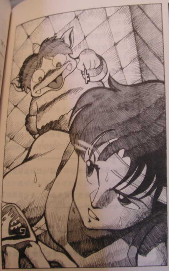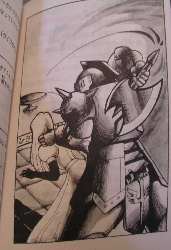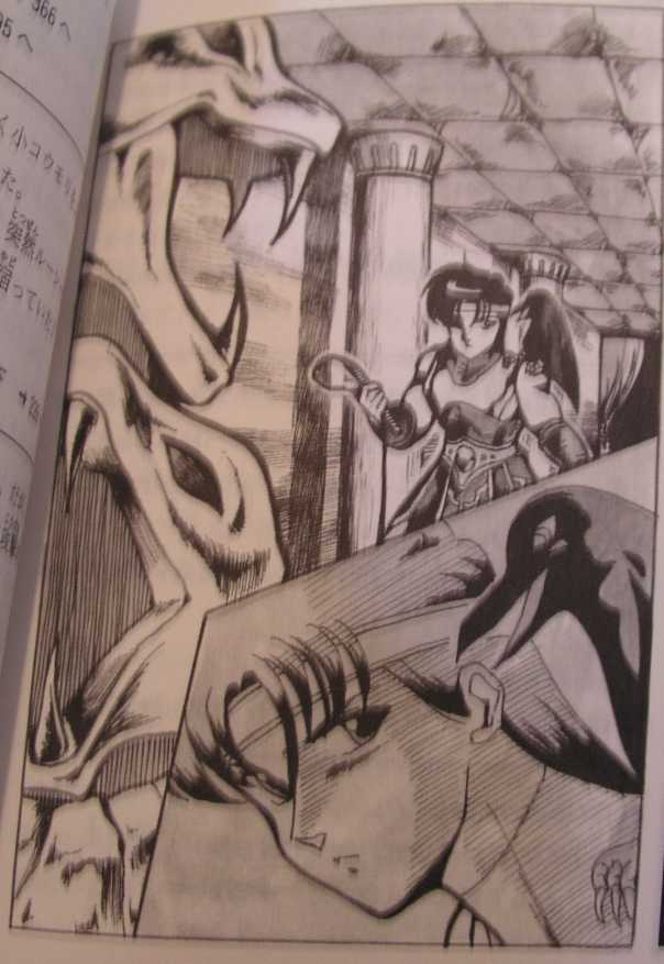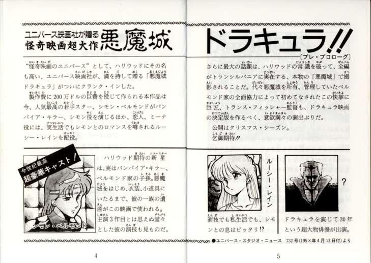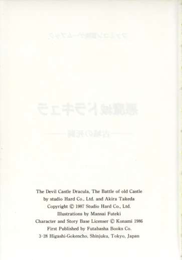 As described by the contributor, Protogem: "This is an Akumajou Dracula 'choose your own adventure'-type book. It was not licensed by konami and therefore the story was never canon. Translated to Demon Castle Dracula: Desperate Fight of the Old Castle, the novel's story is that you are a descendant of the original Simon Belmont in modern times, shooting a movie about his adventures. Dracula is accidentally unleashed on the world again, whence he kidnaps Simon's movie costar Mina, and it is up to the new Simon to defeat him. The apparently contradicting images of the story's outcome are because the book is a 'choose your own adventure' type, and there are multiple paths and outcomes."