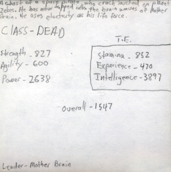 Yes, I know--I had terrible handwriting and an inability to center things. I was young. From looking at the stats, though, you can see where the impetus for this site came from and why I love to use tables. I separated each character into three classes: Dead, Undead or Cyborg. And I ranked them in six categories on a scale of 0-9999, with the mean (average) as an overall score for a tiebreaker during a tournament "comparison" battle. For six years, this was one of my favorite hobbies, and I managed over 700 entries into the The Master of Evil Card Series. Below are some of those entries.