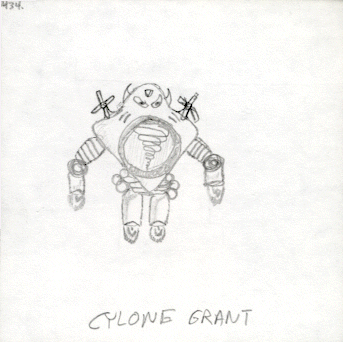 | Cyclone Grant can fly (using jet power), climb quickly, jump high and cause hurricanes and fire storms. Even touching his exterior can lead to instant death via radiation. |