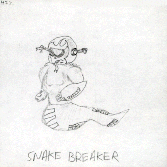 | This sentinel man was repaired using robotics after its devastating injuries. Snake Breaker can fire pellet projectiles that can turn living things into stone. Also, it can manufacture smaller robotic snakes and discharge them out from its helmet holes. |