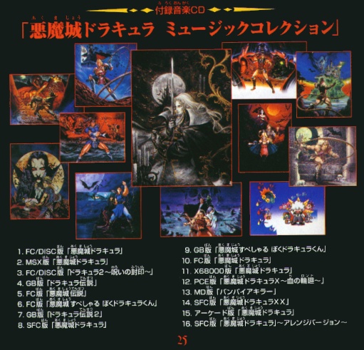 Special Soundtracks: [Dracula Perfect Selection] [Dracula New Classic] [Dracula Battle Perfect Selection Vol. 1] [Dracula Battle Perfect Selection Vol. 2] [Dracula Music Collection] [Dracula X Remixes] [Akumajou Dracula MIDI Collection] [MIDI Power Pro Vol. 6] [Akumajou Dracula Best Music Collections Box] [Castlevania Tribute: Volume 1] [Castlevania Tribute: Volume 2] [Super Smash Bros. Ultimate tracks] [Castlevania Netflix Soundtrack]