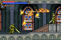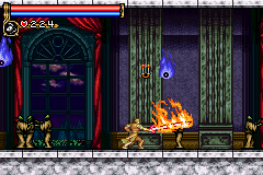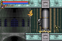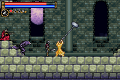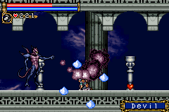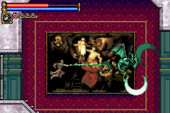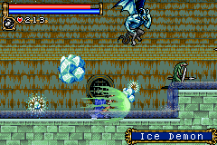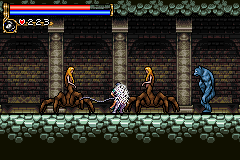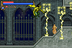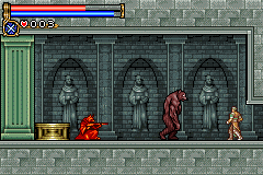 Limitations: Nathan moves rather slowly at the start, and his jumping ability is limited. This will change as he collects magical items: His slide move will help him to speed along and damage enemies at the same time; the dash boots allow him to run quickly and jump greater distances; the double-jump bracelet increases his general jumping range; the kick boots will allow him to wall jump, to clear narrow vertical chambers; and the super jump will see to it that no distance is too great. His whip is limited in that it can't be powered up through normal means, and the brandish move is only circular and can't be controlled as it was in Super Castlevania IV, but the powers available through the DSS system will more than suffice in any situation (that is, if he's luckiest enough to attain the individual powers). Otherwise, the RPG system will decide his more current limitations: Its encompassed statistics--strength, defense, magic power, etc.--can be manipulated upward through the gaining of levels, the location of vials, and the equipping of armor. In the end, really, it's up to the player how powerful they wish Nathan to become. |