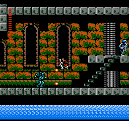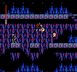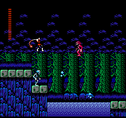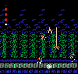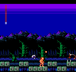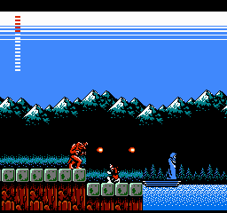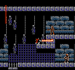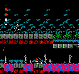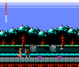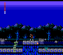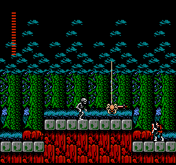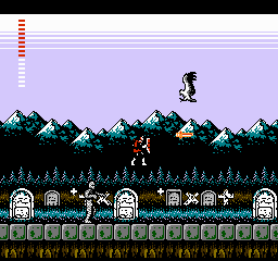 | Limitations: Physically, nothing of Simon has changed from Castlevania: He's still rather clunky while moving on regular land or on stairways. Though, Simon is now a bit quicker in snapping the whip--fortunately, since the enemy assortment is more refined. The standard leather whip is very weak, and it won't be very useful past the first eleven or twelve screens. Since it can't be powered-up, Simon will have to battle and defeat enemies to collect hearts in order to purchase stronger whips. The same goes for sub-weapons: While holy water and daggers (which he's free to use without the draining of hearts) will be valuable early on, they become useless much later. Simon's strength and defense can increase as he collects hearts, too, because they also represent "experience." As he gains experience and thus levels, his energy meter grows, but the increase of the meter as well as the aforementioned attributes is negligible. Additionally, Simon can now use the momentum of up-moving platforms to perform higher-than-normal jumps. |