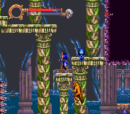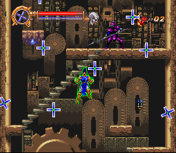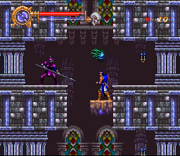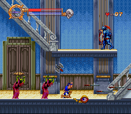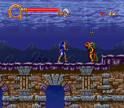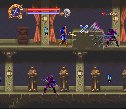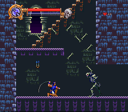 Japanese/European Differences There are the usual liberal changes and slight name deviations for characters like Maria and Annet. Richter is of course "Richter Belmondo" instead of Belmont. There's more in the way of blood, for Richter when his energy is fully depleted and for the Grim Reaper when it receives damage; also, like as it did in Rondo, the Reaper's head pops off when it's finished off. The Warlock's tombstone projectiles feature crosses instead of faces, which means that the Japanese version did maintain those Rondo tombstone sprites. When the boomerang is uncovered, it resembles more of cross, its true namesake, as it lay on the ground. The pre-title Konami logo screen is missing. And, finally, there is no score tally at the end of each stage. (Thanks to Danny for some of this information.) The European version, more for continuity purposes, is titled Castlevania: Vampire's Kiss, which abandons the "Dracula X" label. In contrast to the American version, which is meant as an introduction to the Dracula X universe, the European version is presented more as a standard sequel to Super Castlevania IV. |