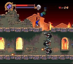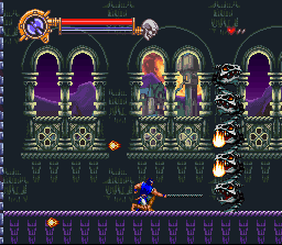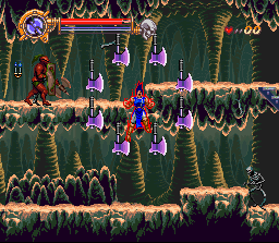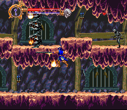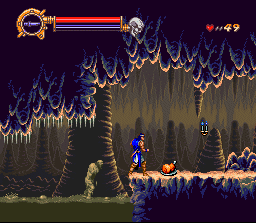 Limitations: Richter is more or less a standard Belmont. He's quick and agile, and his jumps can be controlled very well. Even then, he leaps so gracefully that it's often difficult to pinpoint where he's going to land. Though, he's very under control: Mainly, he can jump onto and off of stairs at will without a problem. Weapon-wise, Richter controls traditionally: He can only swing the whip in two directions, and it can't be powered up past its initial chain whip form (except for the temporary flame blast). Richter makes up for this deficiency with his item-crashing ability; using this ability, Richter can add super power to his sub-weapons (at the cost of hearts) to take down stronger enemies in seconds. Finally, Richter has available a backflip maneuver, which is useful when attempting to escape from in-close combat and incoming projectiles. |