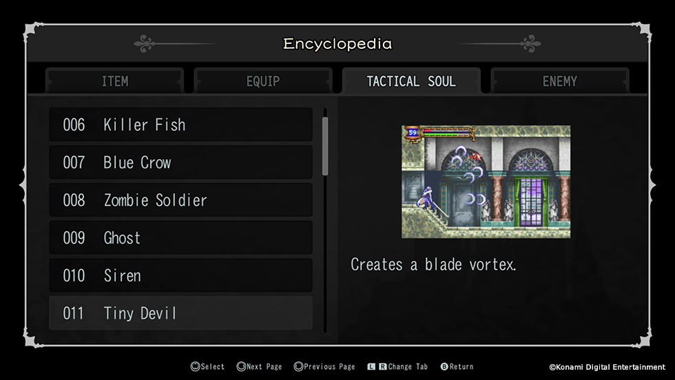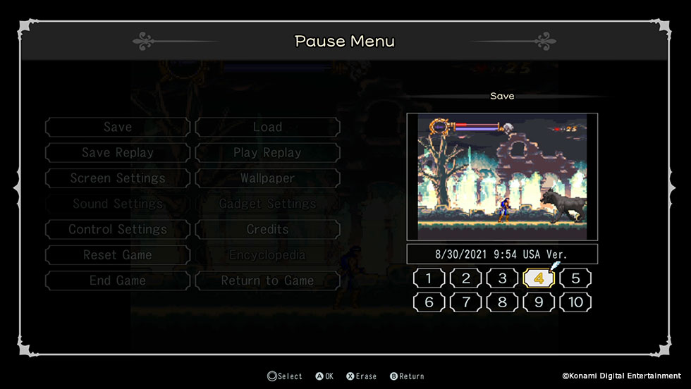 All four games have been updated to take advantage of advanced features like "rewind." Also, pressing the Z2 trigger during gameplay will bring up a menu that offers some options/tweaks: (1) The "Rewind" function. "Save Replay," which records the action of your current play-through and allows you to re-watch it at any time; you can then replay your recorded via by selecting "Play Replay." (2) "Save," which creates a save-state file that you can restore with (3) "Load"; disappointingly, you can only create a single restore file. (4) "Controls," which brings up a sub-menu that details the game's inputs and allows you to fully customize them. (5) Screen Settings. (6) Sound Settings. (7) Gadget Settings. And (8) Wallpaper Selection. Exclusive to Circle of the Moon is an "Encyclopedia" mode that provides a bestiary, an item list, and a DSS combo guide and in effect brings it up to par, feature-wise, with the series' other action-adventure entries.