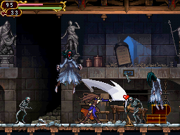 Shanoa is the rare Castlevania hero who is neither a Belmont descendant nor in any way related to them. Though of this distinction, she is the traditional adventure-RPG character. Using her ability to absorb "glyphs" (similar to how Soma Cruz can steal enemy souls), the at-first-limited Shanoa will channel her way to a huge arsenal of attacks--these being the usual striking weapons, projectiles and special maneuvers--that cover for three categories: Main, Back, and Sub; she can combine any three glyphs to unleash a Glyph Union, a superpowered attack that comes at greater expense. Too, she'll amass an inventory of different armor types, which will offer her increased protection against the dark forces. To view the available glyphs and armor types, please visit Ecclesia's weapon page.