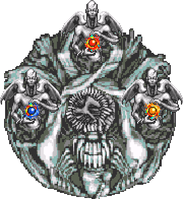 While Dracula doesn't make a physical appearance in Aria of Sorrow, his power's leaking essence does. Since the leaking powers seek a host, and Soma Cruz is deemed to have powers that mimic the Dark Lord's, it's he who becomes a target of the chaos' aggression. It intends to create of out of the young man a true Dracula successor, and it will do this by sapping away his collected souls and using them as means for the transition. The leaking energy manifests into a portal featuring three winged statues, each designated the task of caring for a category of soul; as the portal continues to rotate, Soma's job is to destroy the soul-carrying statues, which have individual powers: The one blue-carrying transforms into a stone-bat creature and quickly lunges toward Soma before returning to its original position. The one red-carrying accurately fires in Soma's direction three diamond-shaped projectiles. And the one orange-carrying targets Soma with a reticule that drains his magic power.
