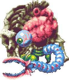 With his power depleted, Dracula takes this form, what I can best describe as a decomposed, disembodied skull that's been cracked in half (or as noted by Cattailwarrior63 a composite of the six body parts). Most pertinent to Juste is that its eyeball is exposed and, for whatever reason, it has a single clawed limb growing out of its jaw joint--the two features on which he must concentrate. Most prominently, it will swirl the claw around at a great distance, the limb extendable, and try to force contact via a foolish maneuver. At random intervals, it will pull back the claw and then quickly re-extend it, in a stabbing motion, toward the exact point in which Juste stands. The eye, too, is active: At any time, it will channel energy and fire forward an expanding laser, which can only be avoided by a crouching Juste. The problem here isn't that the attacks are random--it's that they're prone to happen at the exact same time; in such a case, Juste is destined to take a hit, so it's for him a case of "pick your poison."