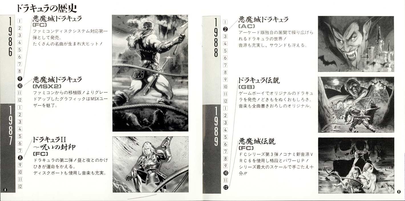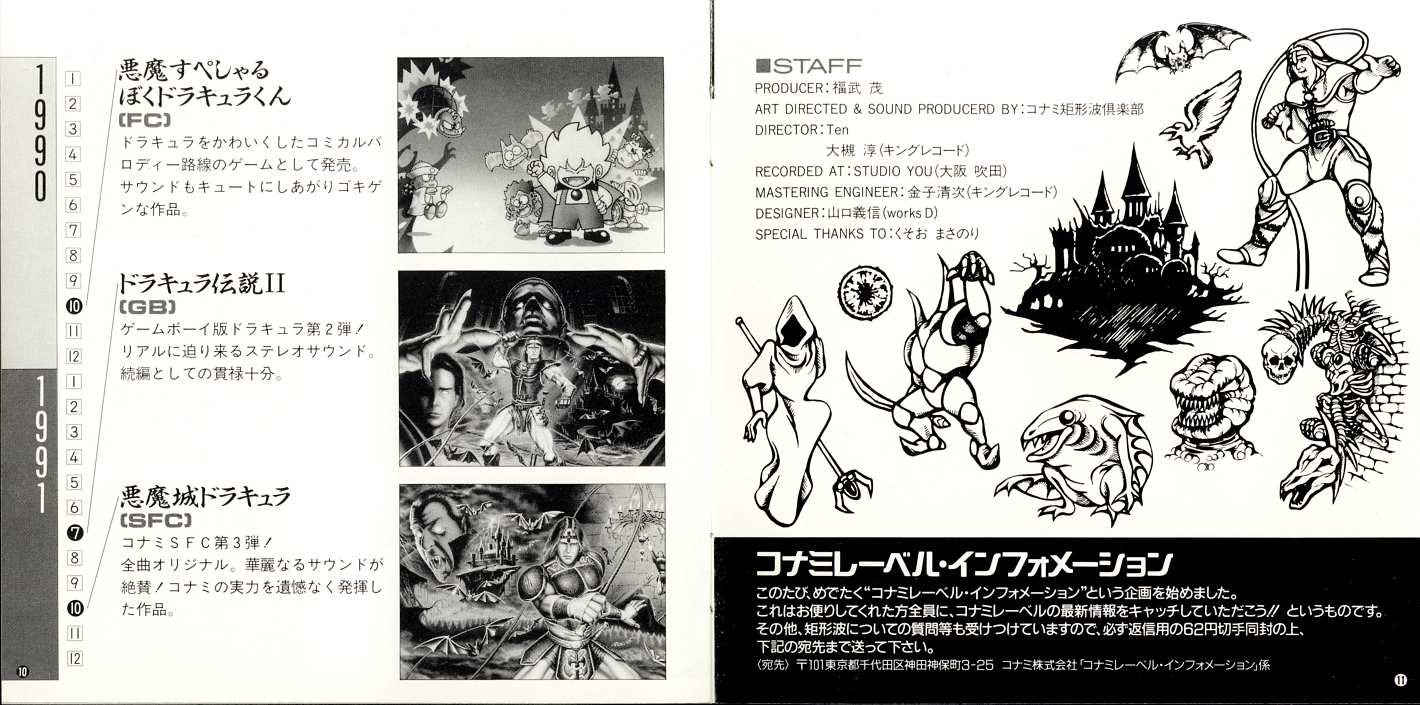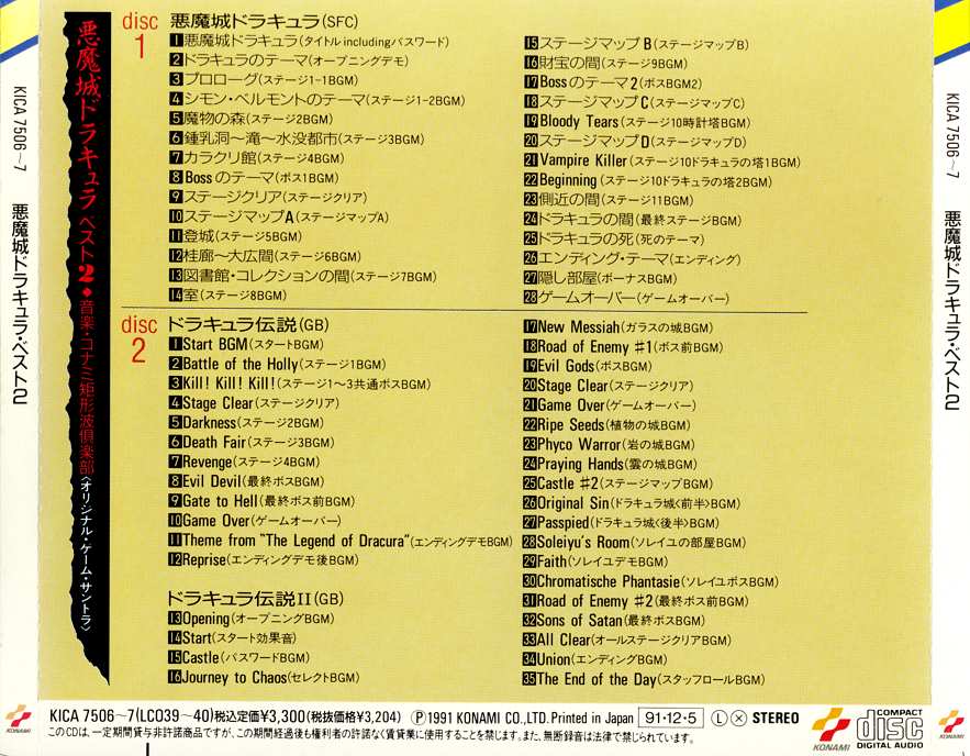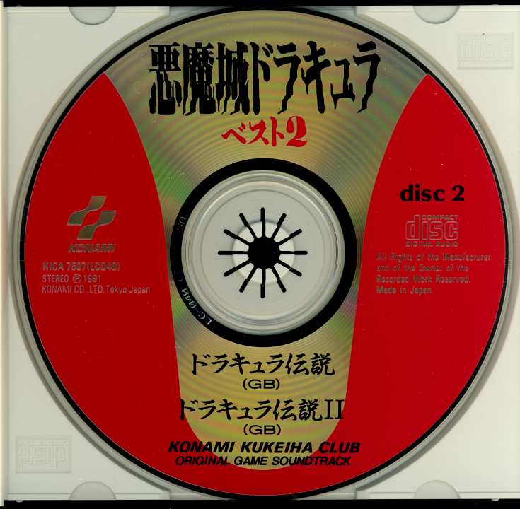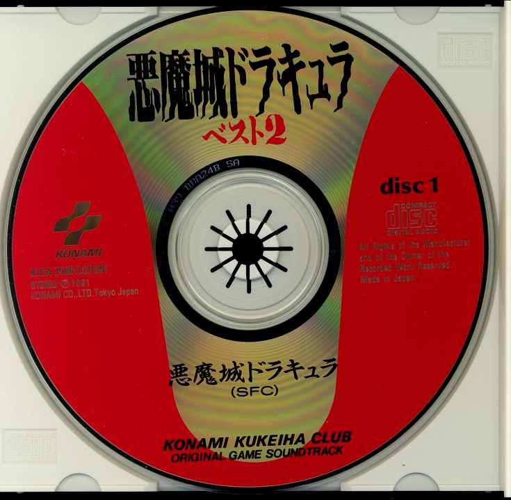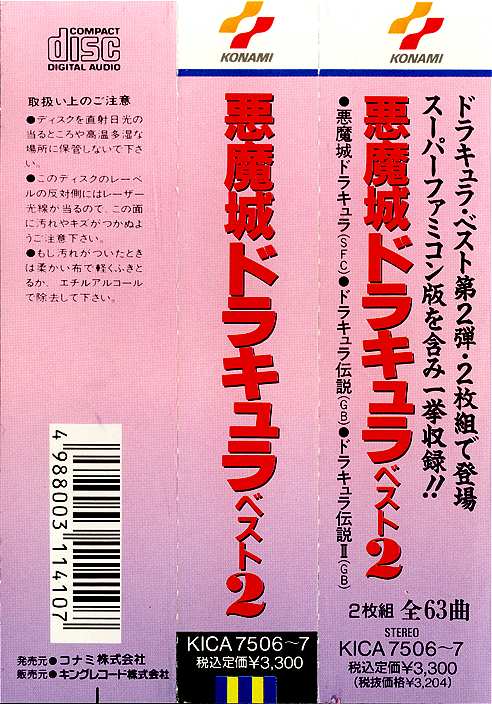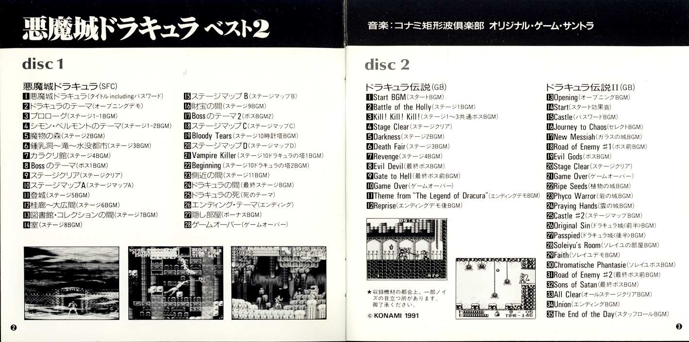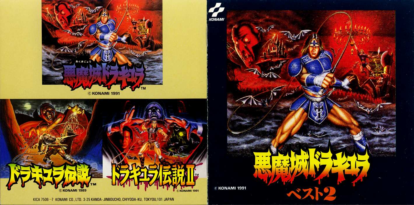This is the "sequel" to 1998's Akumajo Dracula Best, which collected into one package the soundtracks for the three NES titles. 1991's Akumajo Dracula Best 2 (first-release version) keeps with the three-title theme and provides a home for the combined soundtracks of Akumajo Dracula (SNES), Dracula Densetsu and Dracula Densetsu 2. All scans were contributed by JPCVFAN.