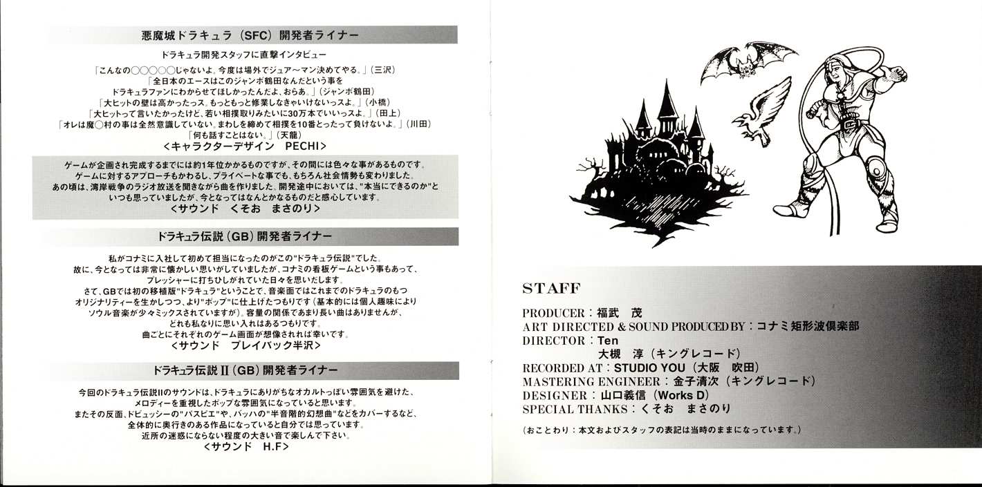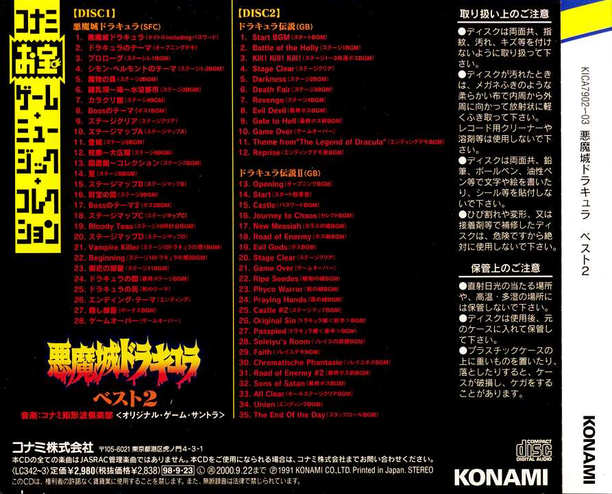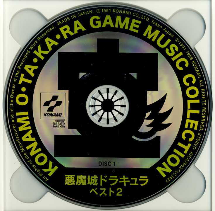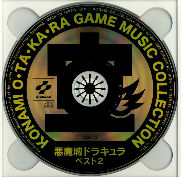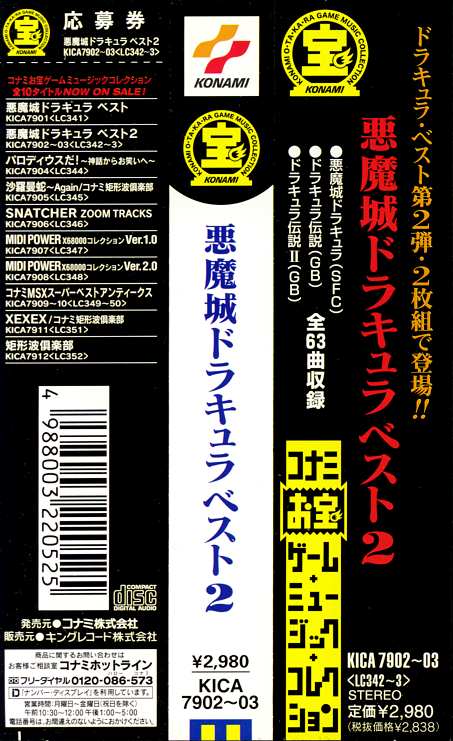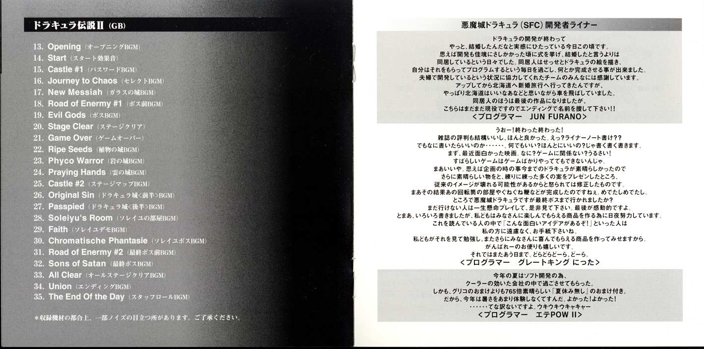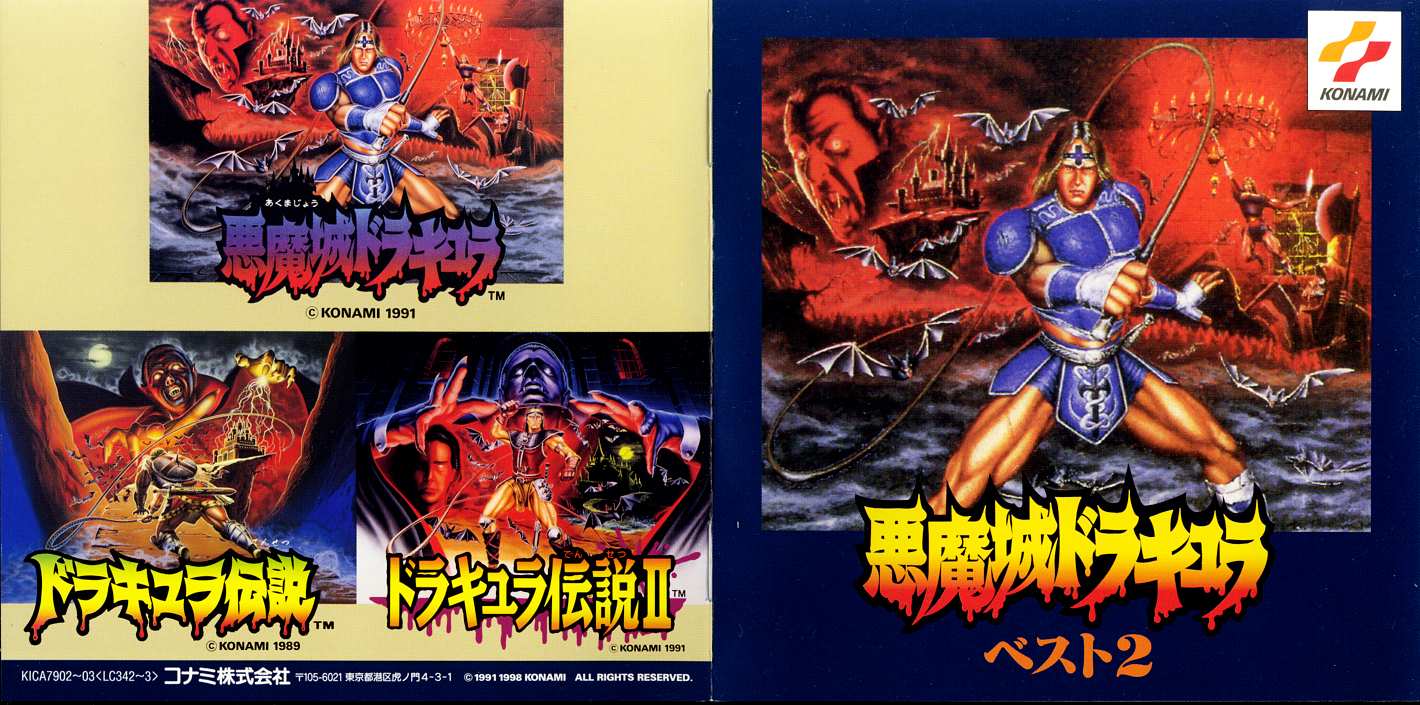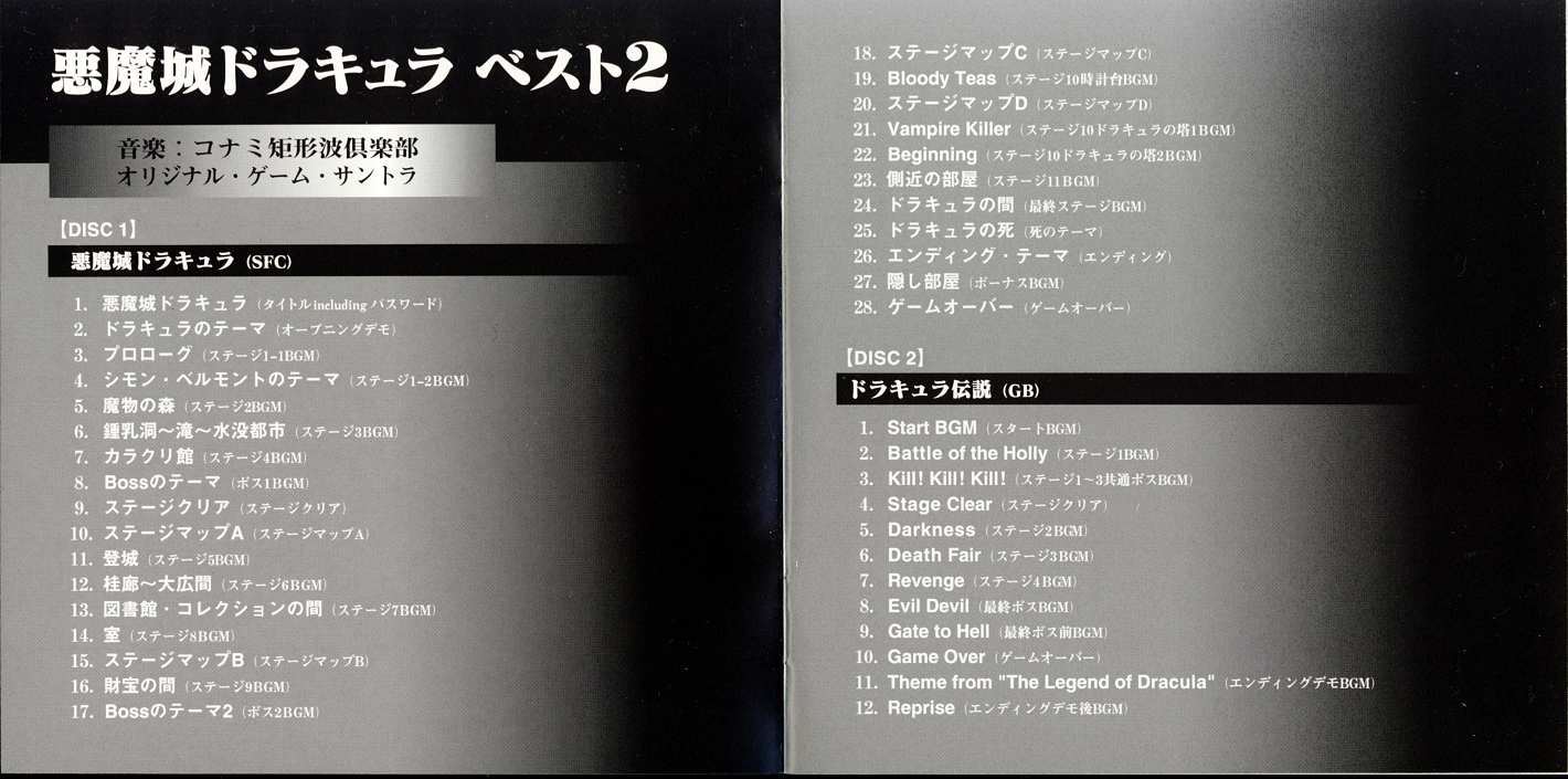 This soundtrack collection is the same-year re-release of Akumajo Dracula Best 2 , which covers the expected titles: Akumajo Dracula (SNES), Dracula Densetsu and Dracula Densetsu 2. The differences between this and the first-release version are all cosmetic--mainly some alternate package-art stylings and a shorter, less interesting manual. All scans were contributed by JPCVFAN.