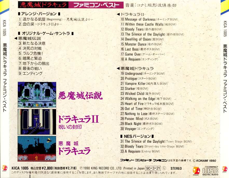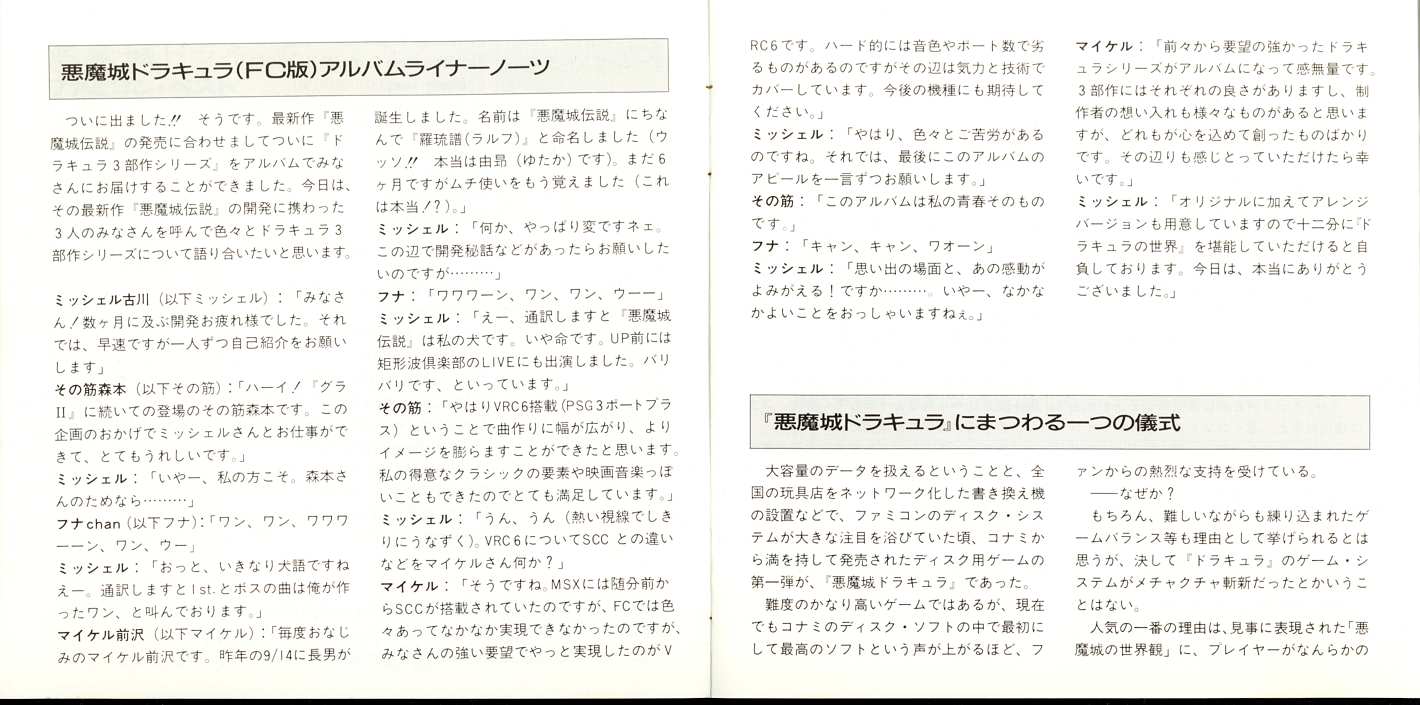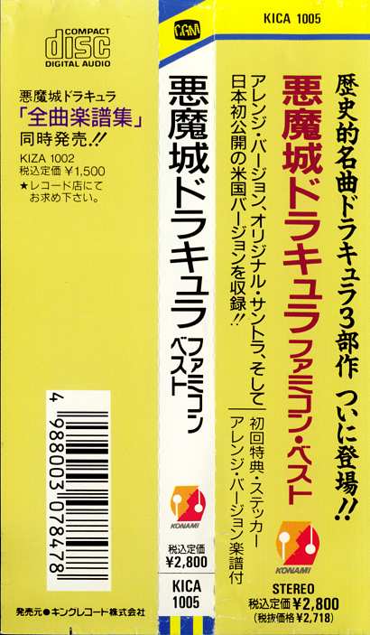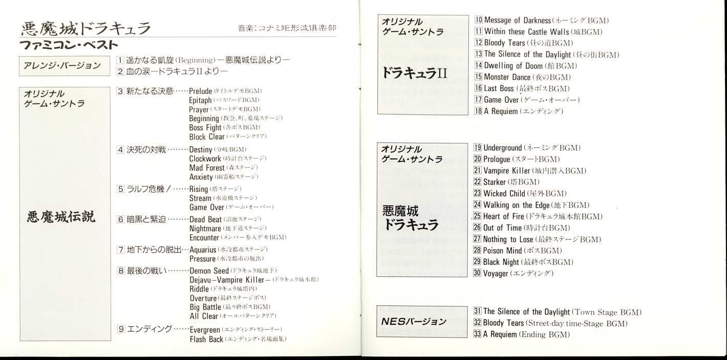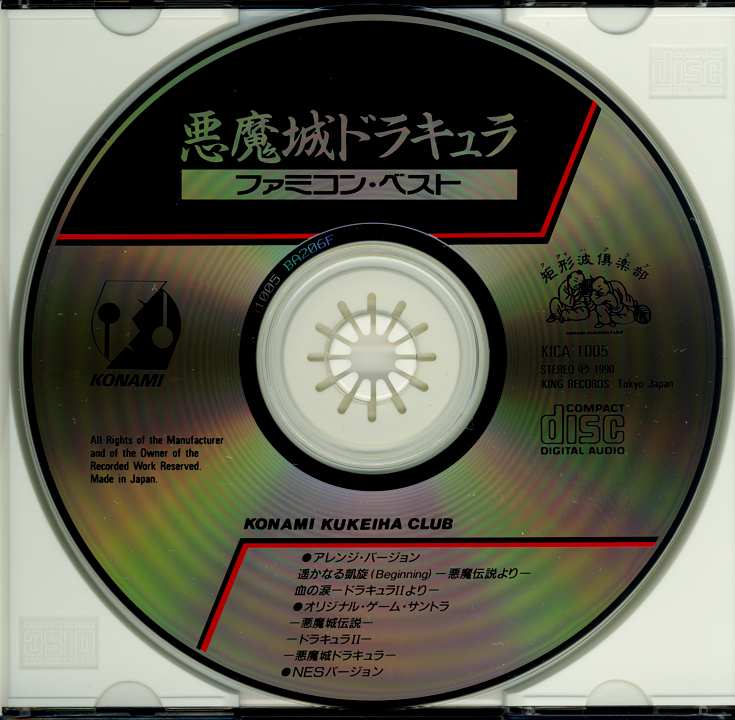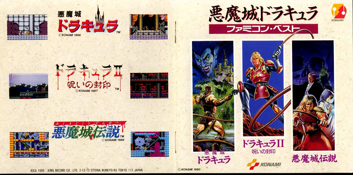 This is the first-release version of Akumajo Dracula Best, which is the soundtrack compilation for music heard in Famicom classics Akumajo Dracula, Dracula 2: Noroi no Fuiin and Dracula Densetsu. Compared to the re-release version, it has a longer manual, it home to sheet music, and some alternate designs on the hardware. All scans were submitted by JPCVFAN.