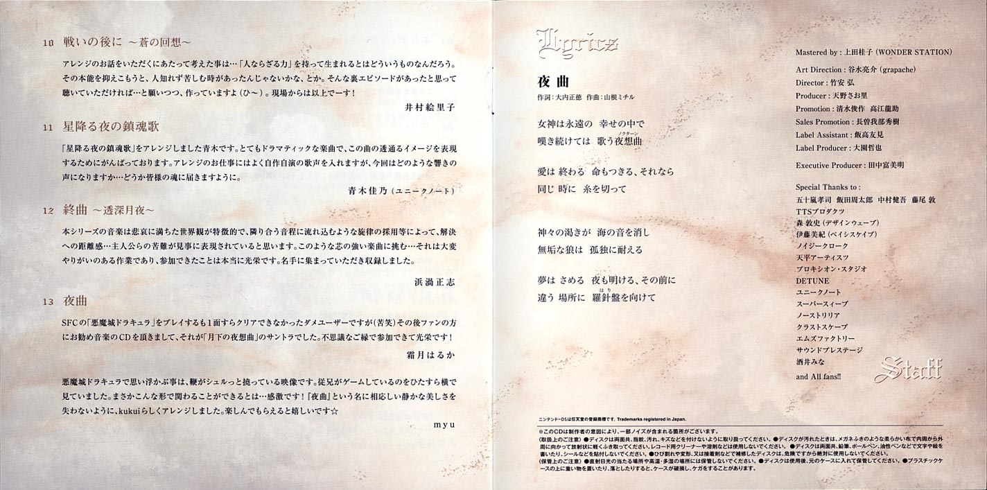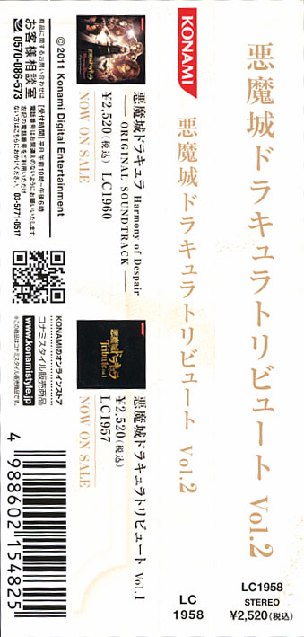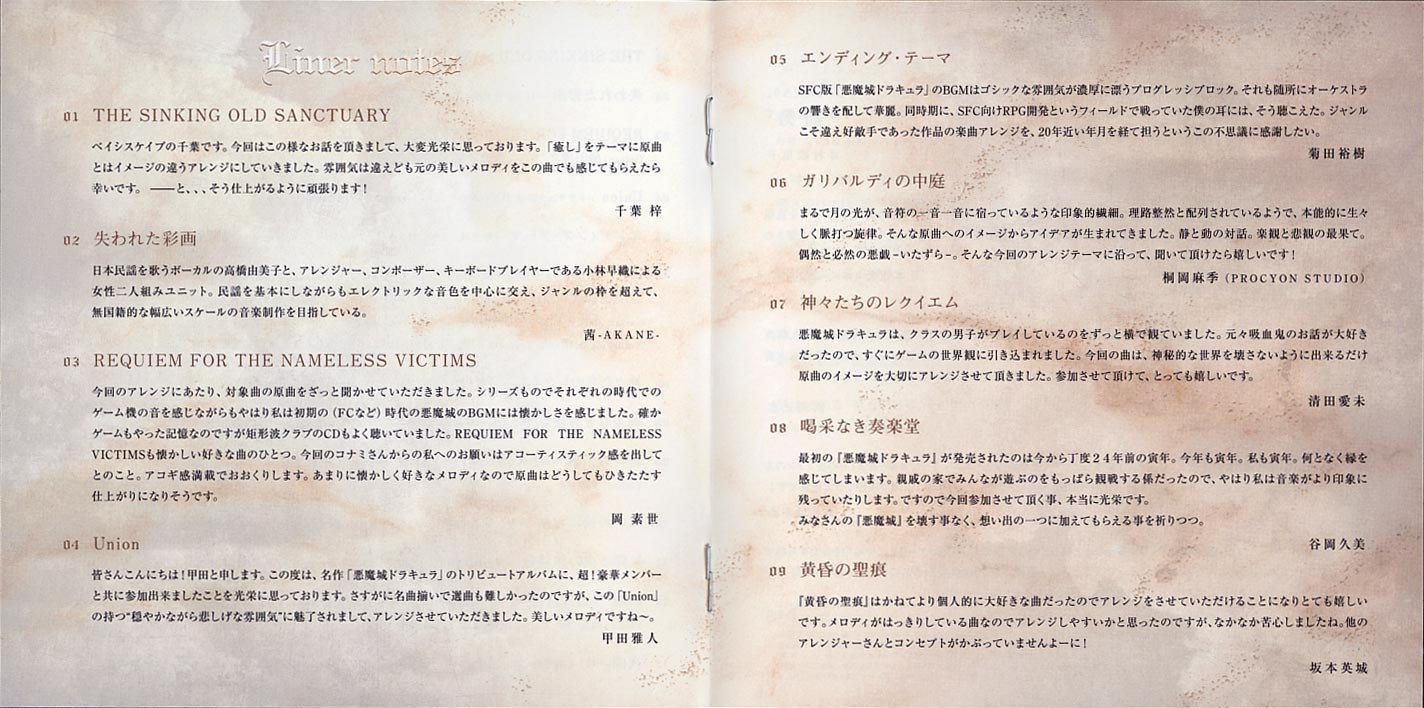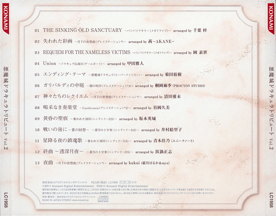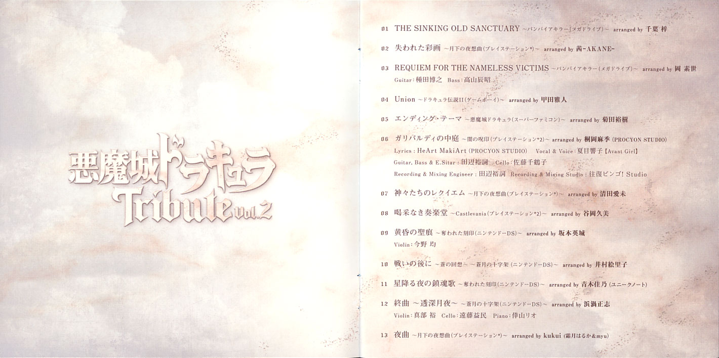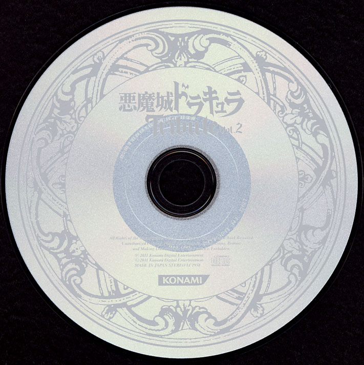 Akumajou Dracula Tribute Vol. 2 is the second of two tribute albums released in January of 2011. Like its predecessor, Volume 2 features orchestral, band-created and chiptune arrangements of 13 classic pieces--this time from Super Castlevania IV, Belmont's Revenge, Bloodlines, Symphony of the Night, Lament of Innocence, Dawn of Sorrow, Curse of Darkness and Order of Ecclesia. All scans were contributed by JPCVFAN.