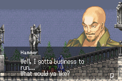 During his investigation, he was captured by the dark forces and imprisoned within Castlevania's study, where a terrifying Great Armor stood guard. It was Soma Cruz who in his mission cut through the evil-infested study and freed Hammer. The very grateful yet pushy Hammer wanted to make it up to Soma (who just wanted to get away from this "strange guy"), so he promised to head back to the castle entrance, where he would live out his dream and set up a "Weapons and Goods" shop. During each of Soma's visits, Hammer sold to the youth newer weapons and items, which greatly contributed to the mission. By the time it was over, Hammer had won over Soma and even made a few other friends in the form of Mina, Yoko, Julius and Arikado. Over the course of the next year, Hammer retired from the military and qualified as an actual licensed merchant. The aimless and irresponsible Hammer also became an information broker thanks to his shady business connections. It was through these channels that Hammer was able to relay to Soma Cruz the location of Celia Fortner and her cult's hideout (about which Arikado and the Church volunteers didn't want Soma to know) in the snowy mountain regions of Europe. When Soma arrived at the entrance, Hammer, who was tailing him, made known his presence. Soma was upset that Hammer took it upon himself to get further involved, but the rough and resolute merchant convinced the lad to let him stick around so that he could open up a shop and again assist in the mission. Though he would surely provide a helping hand, Hammer had an ulterior motive: He thought for sure that Yoko Belnades, on whom he had a secret crush, would also show up. He was saddened by her absence. However, nothing made Hammer as happy as to see Soma Cruz escort Yoko to an abandoned building right across the way from his very shop. He had it made: He could go about his business and keep an eye on Yoko. During Soma's visits to his shop, he continued to use the annoyed youth as middle man to find out about Yoko's true feelings. As of Dawn of Sorrow's conclusion, there's no word as to whether or not a relationship was forged. Regardless of his selfish motives, he again came through for his friend, and he, too, was there at mission's end to comfort the victorious hero. |